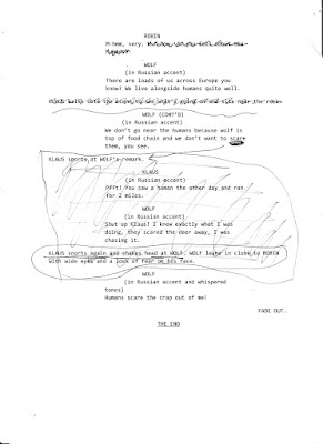 Despite this however, we did manage to speak to Sara about our script and she thought that it was really good. She shared my worries about the script seeming too long and suggested that we cut the second wolf character, as it wasn't necessarily needed to help the story. By doing this we have given ourselves a lot more time to act out the actions and make our gags more effective.
